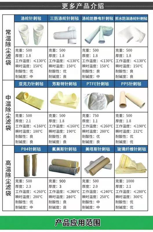 除塵器濾袋(除塵布袋)堪稱除塵器的心臟,濾袋的選用至關重要,它直接影響除塵器的除塵效果。選用濾袋(除塵濾袋)從下列幾個方面選擇:氣體的溫度、潮濕度和化學性;顆粒大小;含塵濃度;過濾風速;清塵方式等因素綜考慮。