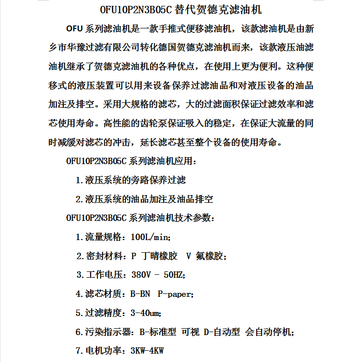 替代賀德克濾油機OFU10P2N3B05C
