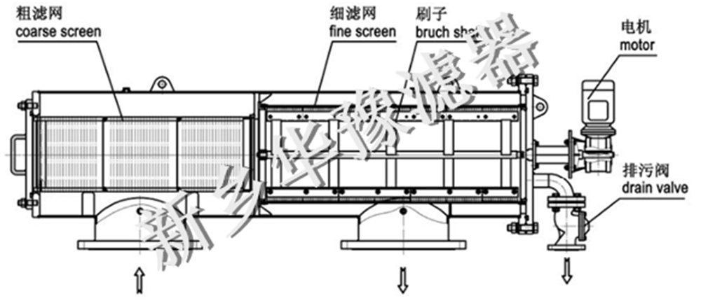 污水由設備的入水口進入過濾器內,粗濾網先對污水中的體積較大的雜質進行攔截,防止這些雜質進入機體內部后損壞機體內的部件。粗濾后的水流向機體另一端的細濾網,細濾網對水中的雜質及污物進行最后的攔截。因為污垢對濾網的堵塞,使濾網內部和濾網外部生壓力差,當這個壓力差達到壓差開關的設定數值時,電控箱發出清洗、排污信號,控制機體上的排污閥與清掃電機同時打開。電機轉動帶動機體內的不銹鋼刷對濾網上的污垢進行清理,再通過排污口排出污水,完成一次自清洗過程。該過濾器同時安裝有定時控制器,可在一定時間間隔內定時排污。